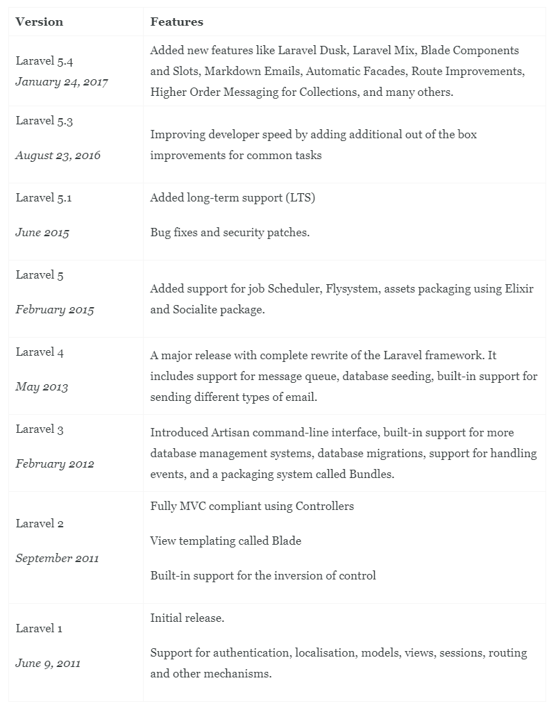 The following table lists all the major Laravel framework releases in the reverse chronological order.